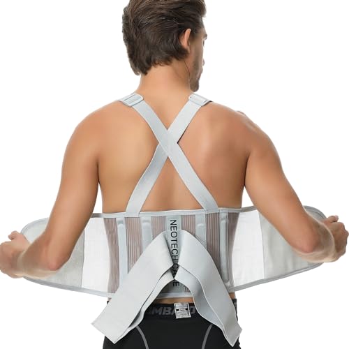 NeoTech Care Back Brace with Suspenders\/Shoulder Straps - Light & Breathable - Lumbar Support Belt for Lower Back Pain - Posture, Work, Gym - Grey Color (Size XL)