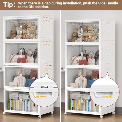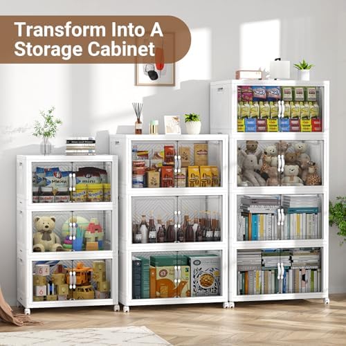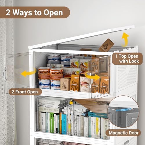 BROVIEW 640QT Extra Large Stackable Storage Bins, 160Gal Clear Plastic Closet Organizer Cabinet with Lid and Wheels, Collapsible Latch Boxes Folding Drawer with Door for Home Kitchen, V20 4Pack White