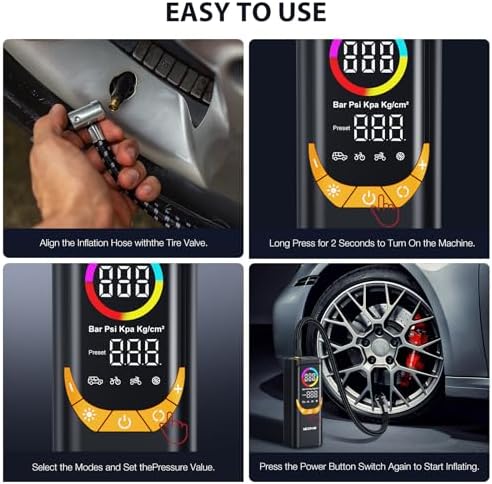 NEXPOW NP17 Portable Air Compressor, 150 PSI Digital Tire Inflator, Fast Inflation with Auto Shut-Off, LED Light, Multiple Nozzles for Car, Bike, and Ball, Compact Design, Yellow