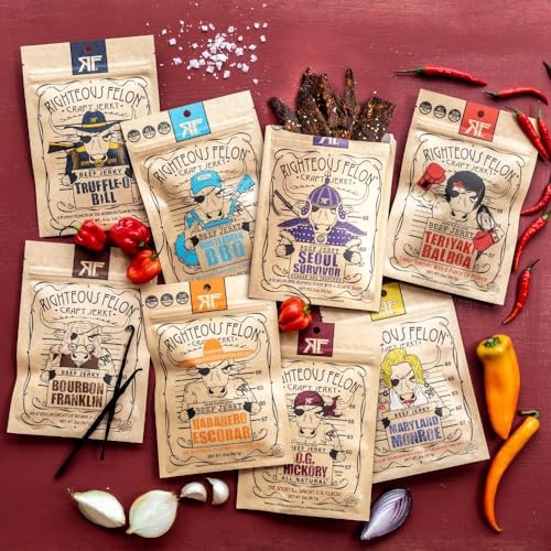 Righteous Felon Beef Jerky Variety Pack Gluten Free Beef Jerky Snack Packs for Adults High Protein, Keto-Friendly, Low Sugar Made with Premium Meats Gifts for Men Sampler 8 Pack