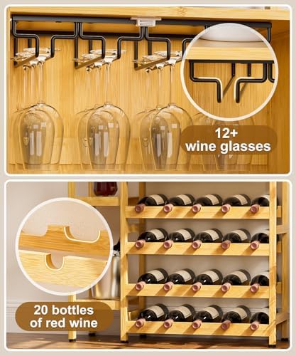 Cozivolife Wine Bar Cabinet,Wine Rack Floor Free with Doors Glass Holder,4 Tiers Wine Bottle Storage and Side 4-Layer Shelves for Living Room, Dining Room, Kitchen(Bamboo)