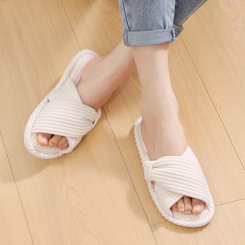 Evshine Summer House Slippers for Women Corduroy Cross Bow Indoor Slippers Open Toe Slip On Bedroom Shoes with Memory Foam