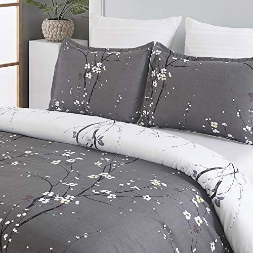 YEPINS Soft Brushed Microfiber Duvet Cover Set with Zipper Closure and Corner Ties, Plum Blossom Branch Floral Printed Pattern, Grey and White Color, Reversible Design- Queen(90x90 inches)