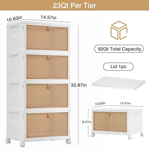 VECELO 4 Tier Storage Bins with Lid, Stackable Storage Boxes with Magnetic Doors & Wheels, Foldable Storage Containers, 23 QT Closet Organizers and Storage for Living Room, Office, Dorm