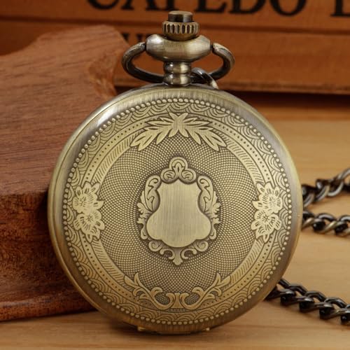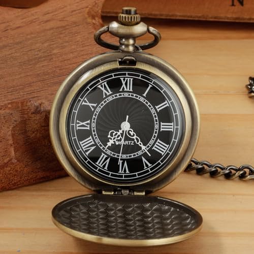 Realpoo Bronze Smooth Cover Roman Men's Quartz Pocket Watch, Black Roman Digital Dial with Chain
