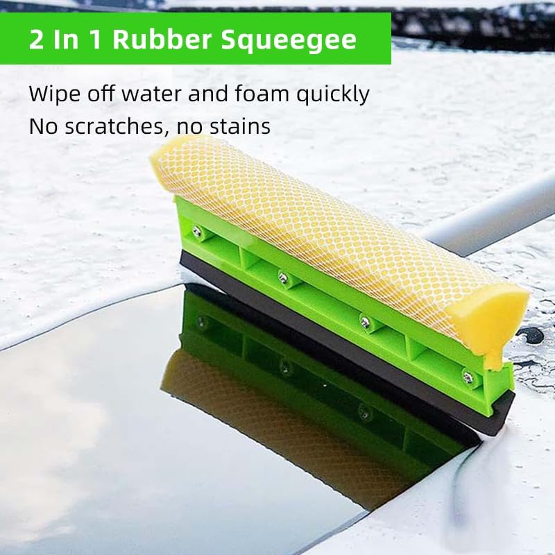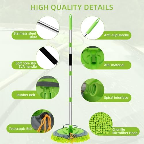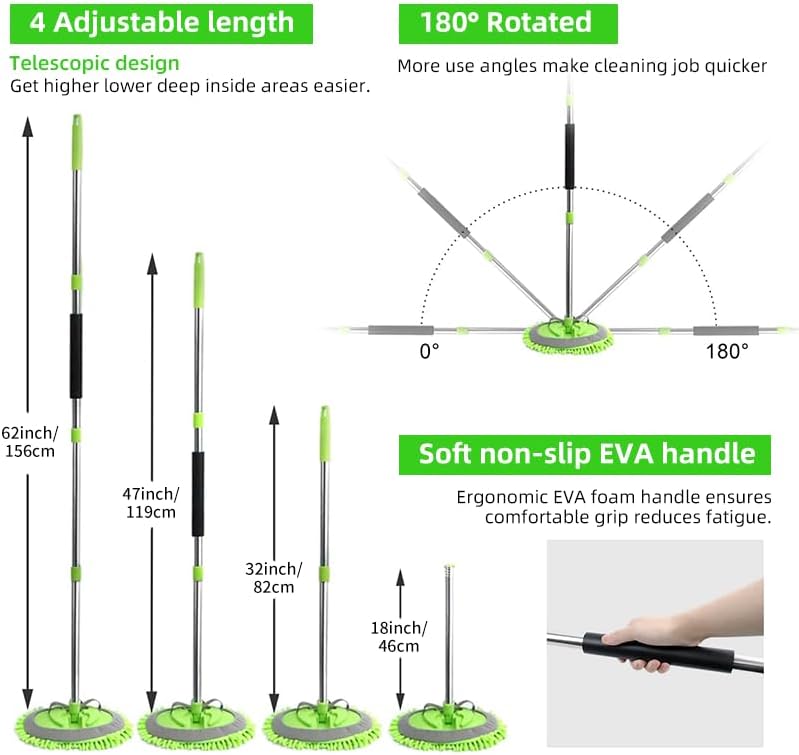 【62” Super-Long Pole Car Wash Brush】The car wash mop has 4 poles and you will amazingly find they can be assembled into 32”,47” or 62” by using 2, 3 and 4 poles. Hence adjustable length of this car brushes for washing greatly help you clean different height, protecting you from stretching bending or twisting to get everything done. 【2-in-1 Car Washing Brush】Assemble the chenille, turn it into a long mop, and clean the exterior of the car conveniently. When the pole of car brush is disassembled, the wall cleaning mop head can be used as a mitt, sponge, rag to make a super easy car cleaning. A soft and absorbent microfiber chenille head, which is scratch-free and gentle on the car's surface. It effectively picks up dirt and grime without leaving any scratches behind. 【Sturdy Connection-design】The design of the spiral link is no worry that the car wash brush with long handle will be retracted or stretched to make the truck washing equipment rod stable and firm, no scratch your car or make you lose the patience to wash cars.180°mop head rotation & anti-slip handle of car cleaning brush can easily control the truck wash brush and adjust the angle to make cleaning more convenient. 【Scratch-Free Microfiber Wash Car Brush Head】Car wash sponge mop head works in a way that it collects the particles of grime and dirt by trapping them into the washing mitt fibers. This mop head is soft, absorbent, lint-free, swirl-free and scratch free, it is also safe on paint and other delicate surfaces, especially safety for car surface. Long life,Reusable and washable. 【Multifunctional Windshield Squeegee】After finishing a comfortable bath for cars, it is time to use car window windshield squeegee to scrape foam-water as a breeze with soft rubber blade. Fast and streak-free drying to maintain a gorgeous shine on your car. The car wash squeegee fitted with poles is also great for window, glass, door, mirror at home. 【Wide Application】This car cleaning supplies kit offers a convenient and effective solution for maintaining the cleanliness of your vehicle.This is perfect helper for washing, drying, waxing, dusting and polishing your vehicles or household.Not only can you wash a car,truck,suv, motorcycle, rv, but it’s awesome for windows, dusting, ceiling fans, sheds, kids slides/ outdoor structures and your home accessories!