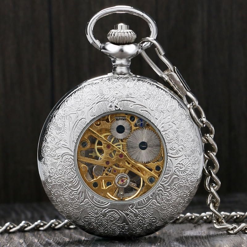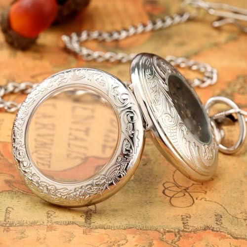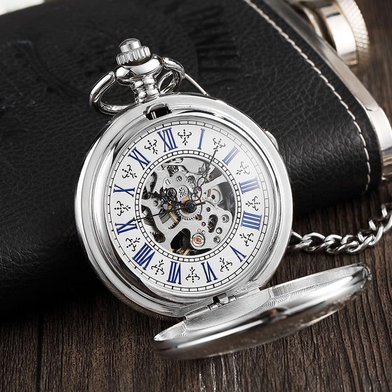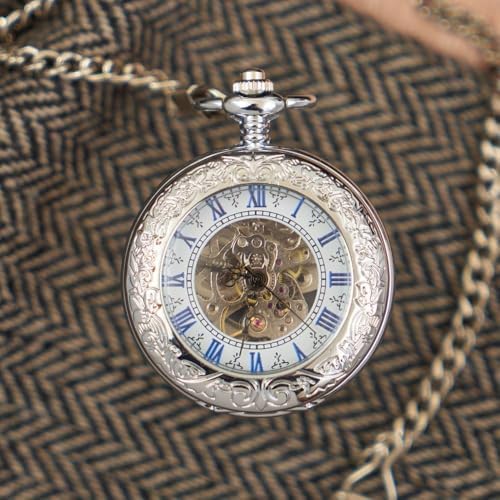 BOSHIYA Retro Mechanical Pocket Watch Men's Night Light Steampunk Pocket Watch with Chain Black Skeleton Dial Roman Digital Pocket Watch Father's Day Gift