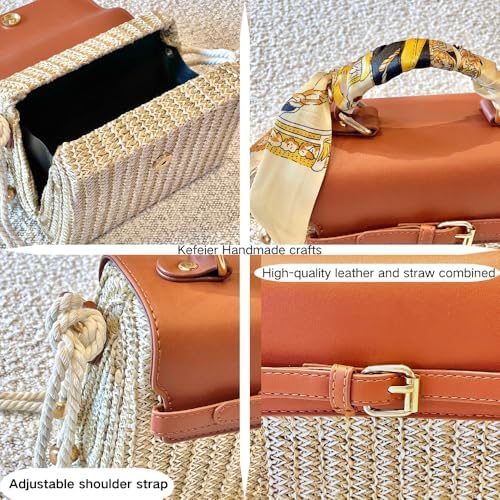 Kefeier Top Handle Straw Crossbody Bags for Women, Summer Straw Purses and Handbags Shoulder Clutch Beach Bag with 1 sun hat, 3 Color Scarf Handle, Rope Strap, Natural