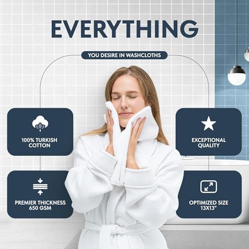 White Classic Luxury Cotton Washcloths 13x13 Inch - 650 GSM Turkish Cotton Hotel, Spa, Bathroom Face Towel 12 Pack